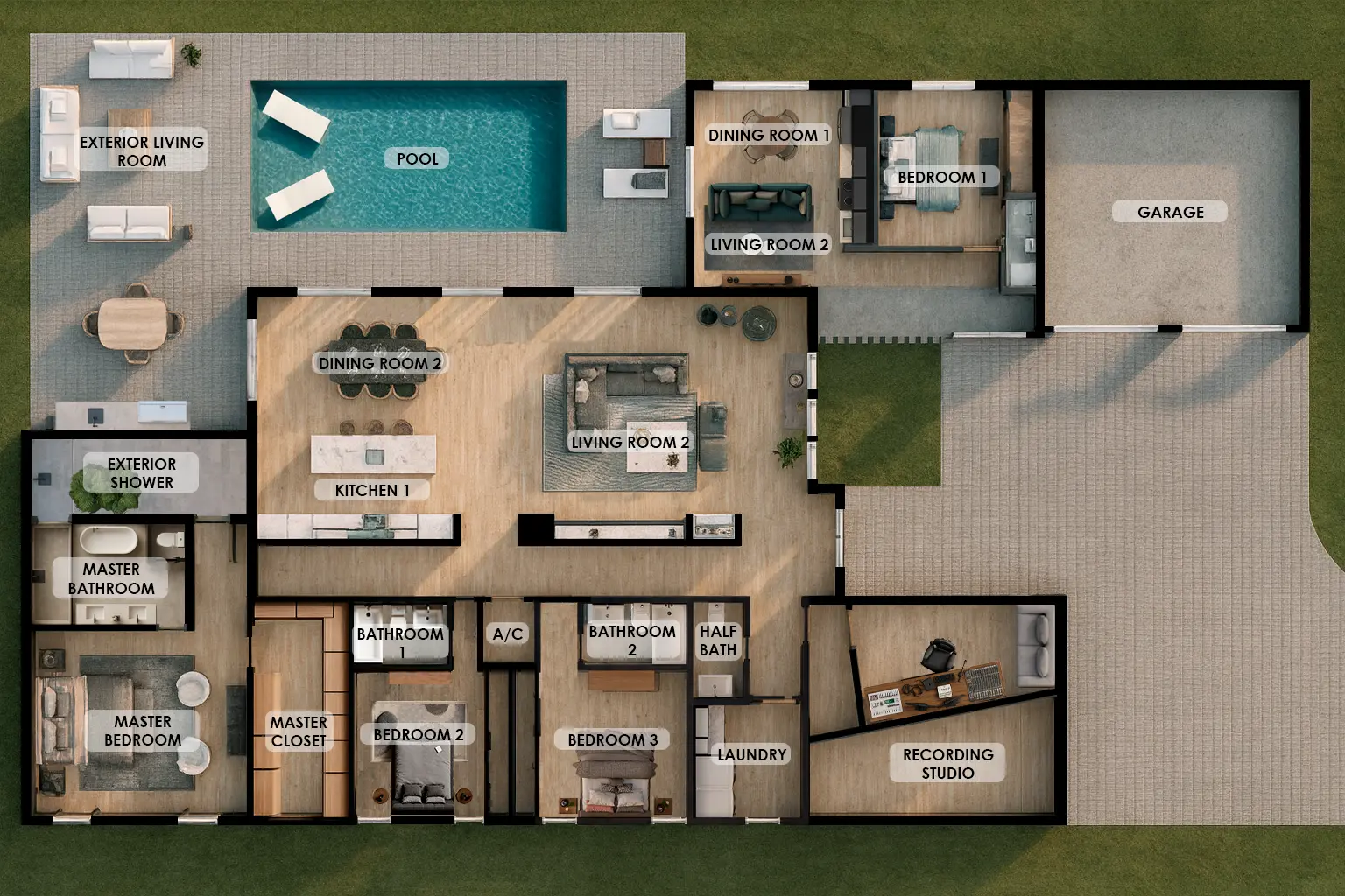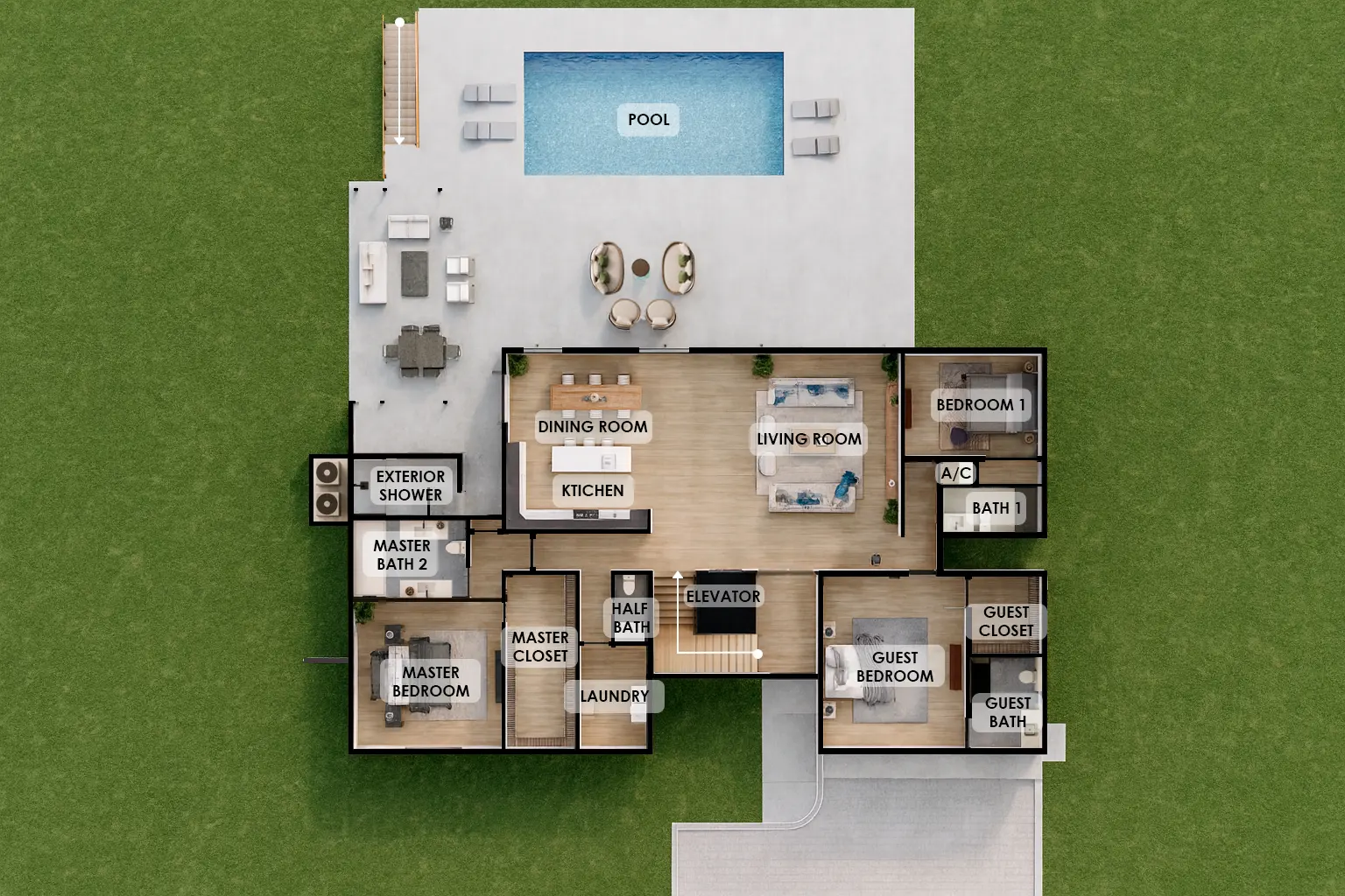 The Agape features a gourmet kitchen with a central island and wet bar, creating a seamless flow for cooking, dining, and entertaining. A dedicated entertainment room provides the perfect setting for gatherings, while a private guest suite offers comfort and privacy for visitors. Everyday convenience is enhanced with a laundry room, centralized air conditioning, and a walk-in closet in the main bedroom.