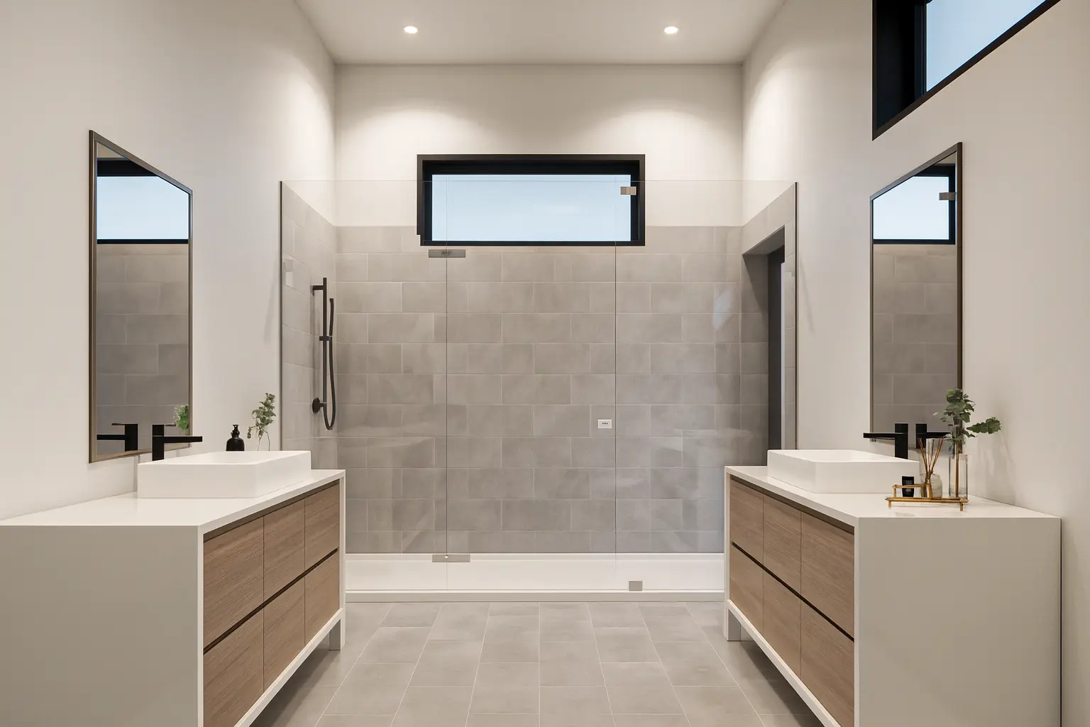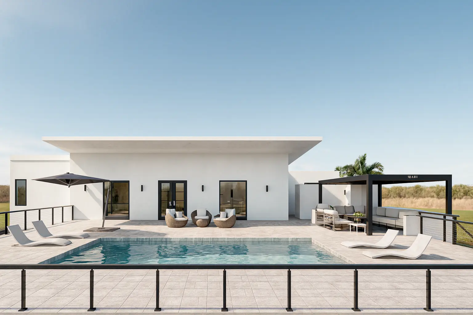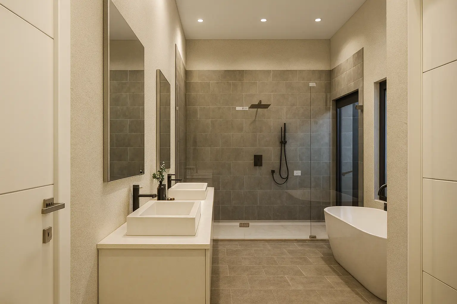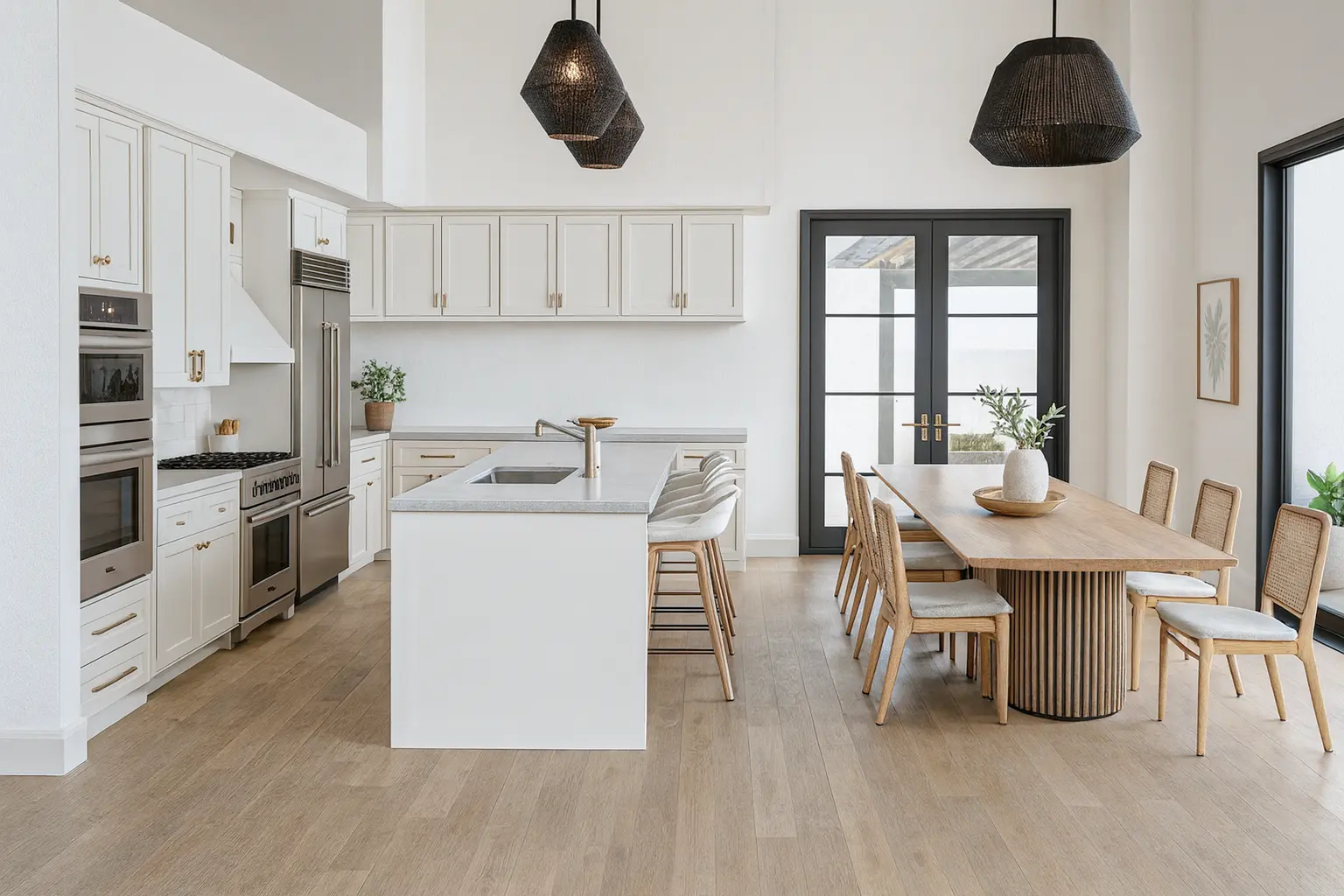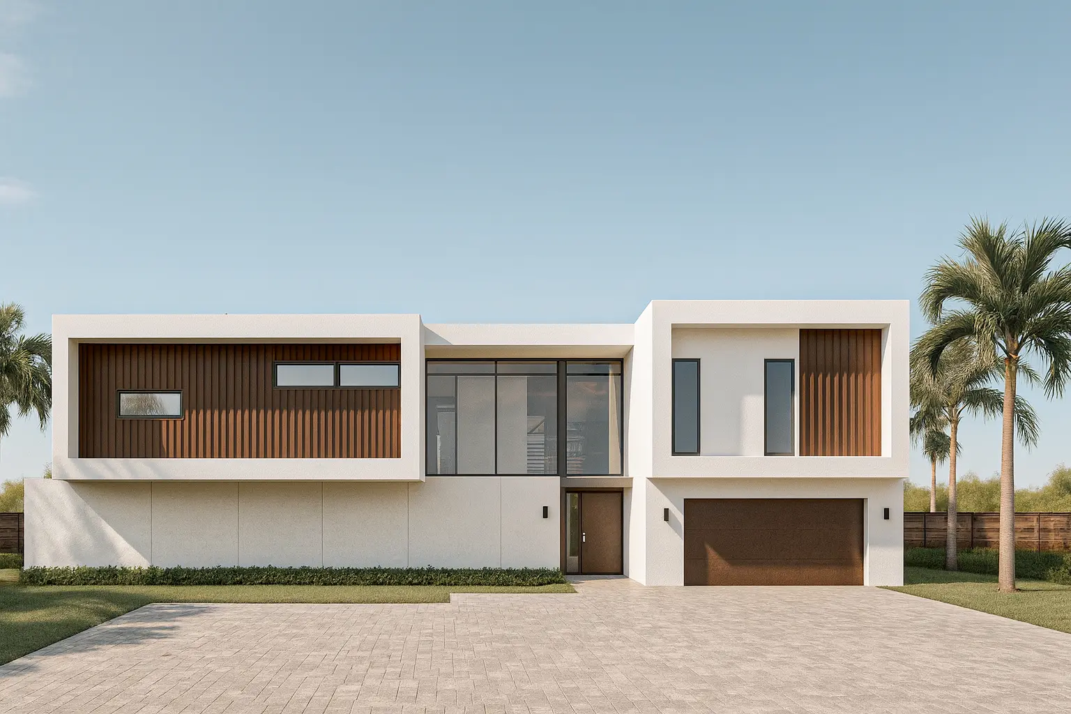 The main bathroom includes a luxurious bathtub, while an exterior shower adds a refined outdoor living element. Elegant French doors connect the interior to spacious outdoor areas, enhancing natural light and indoor-outdoor flow. A two-car garage provides secure parking and additional storage.