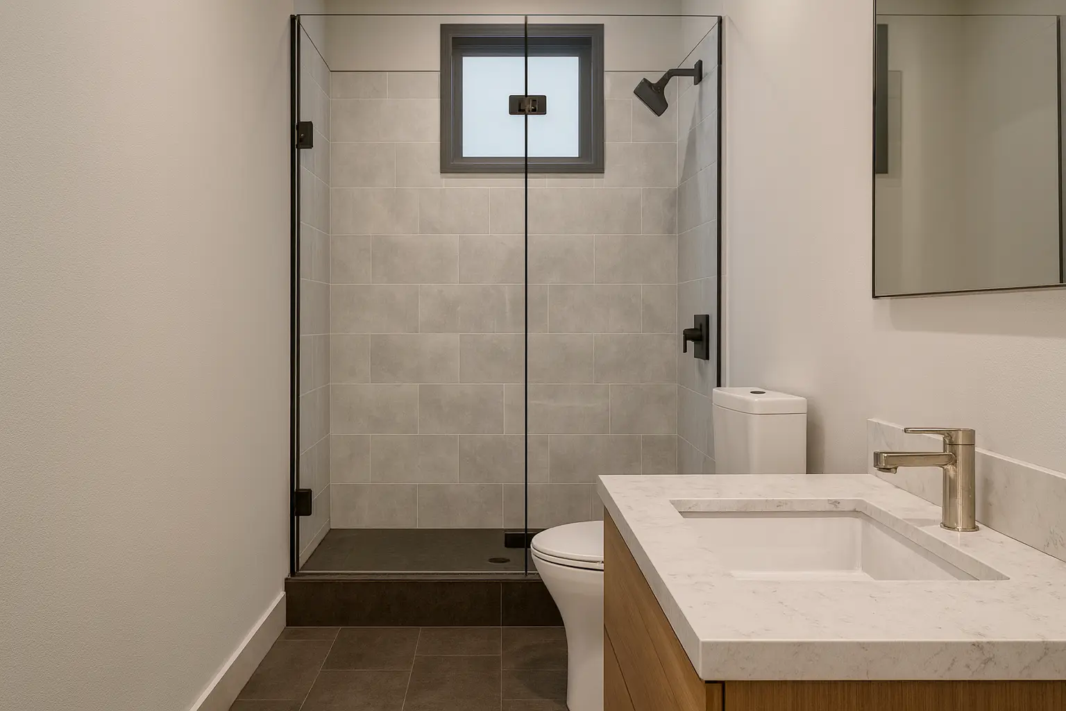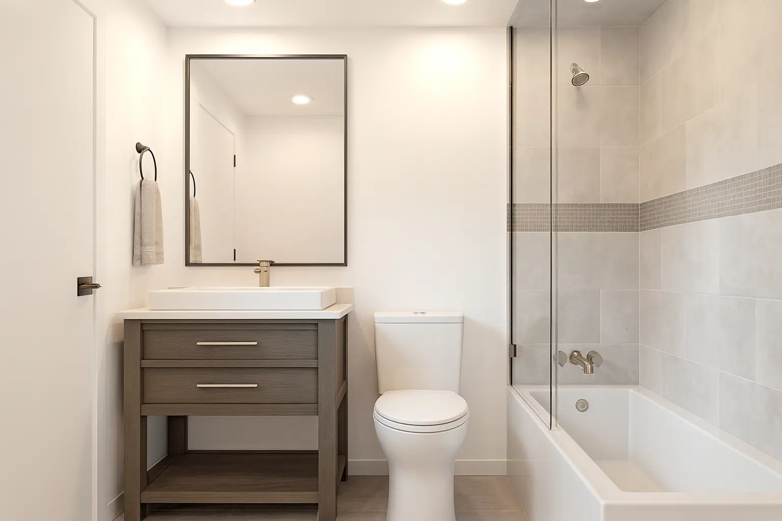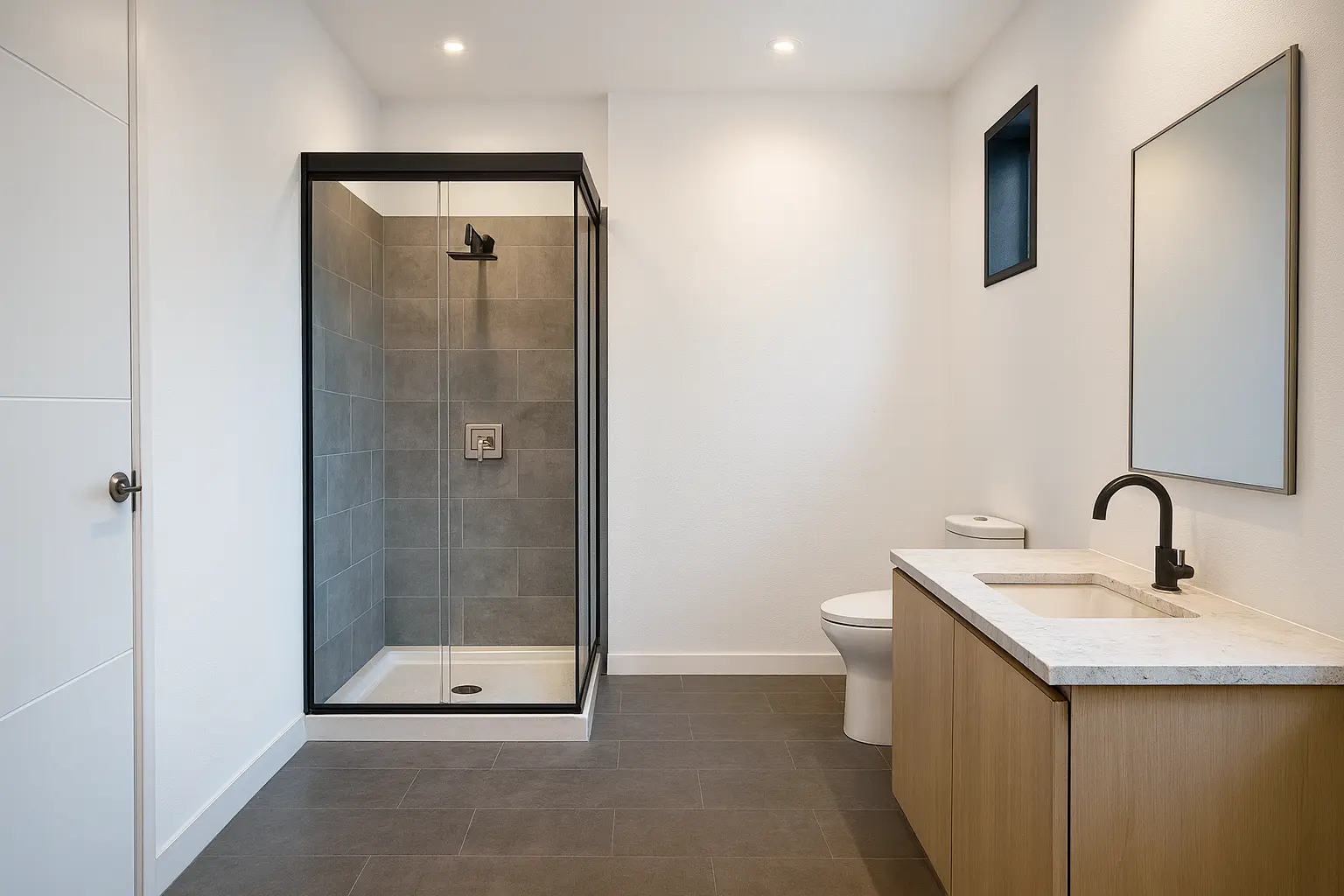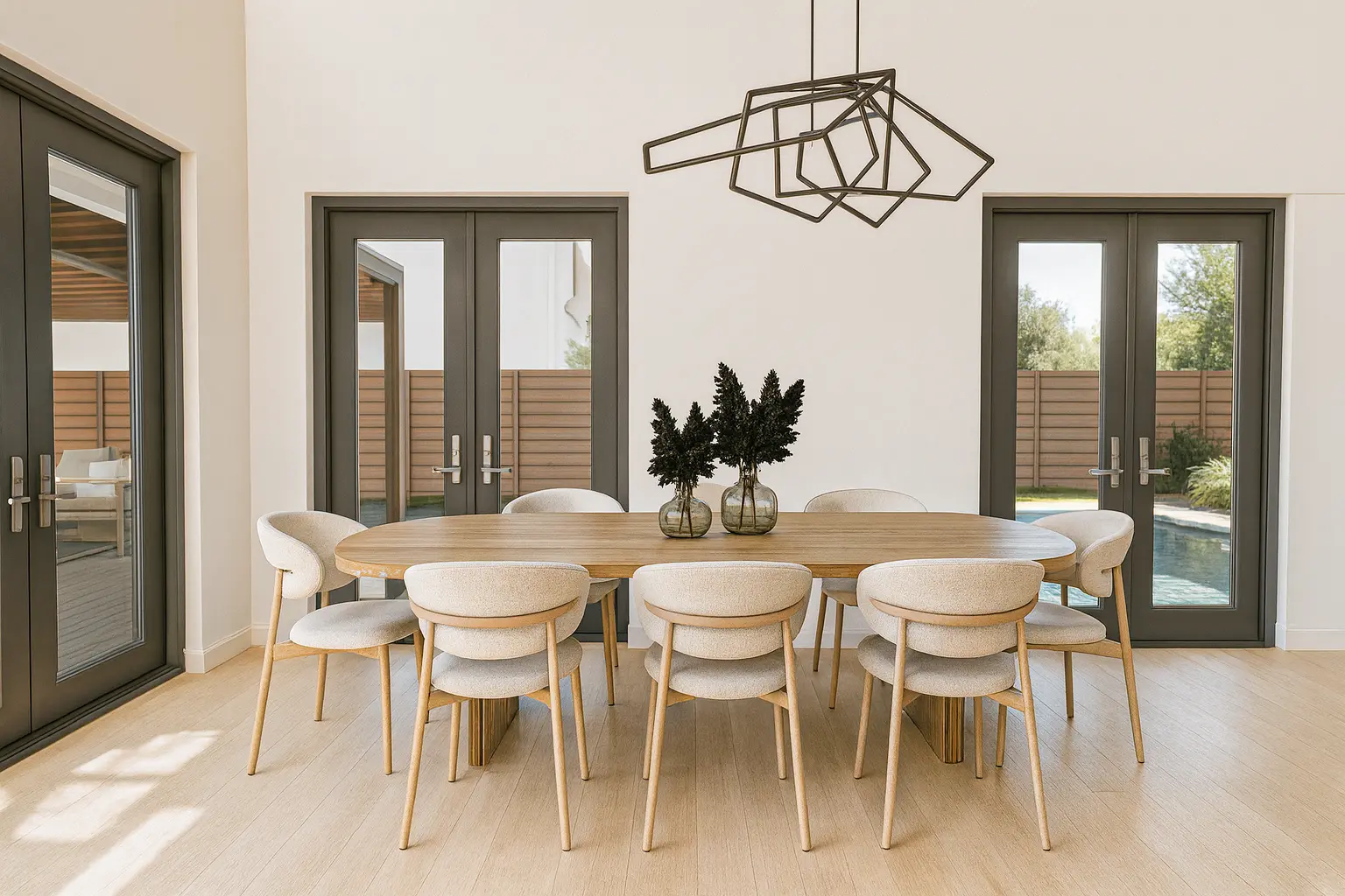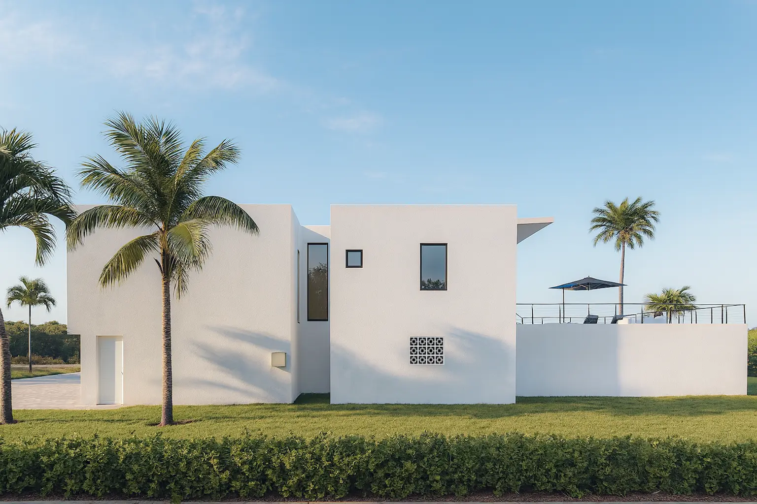 The main bathroom includes a luxurious bathtub, while an exterior shower adds a refined outdoor living element. Elegant French doors connect the interior to spacious outdoor areas, enhancing natural light and indoor-outdoor flow. A two-car garage provides secure parking and additional storage.