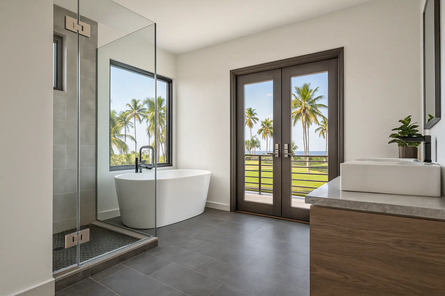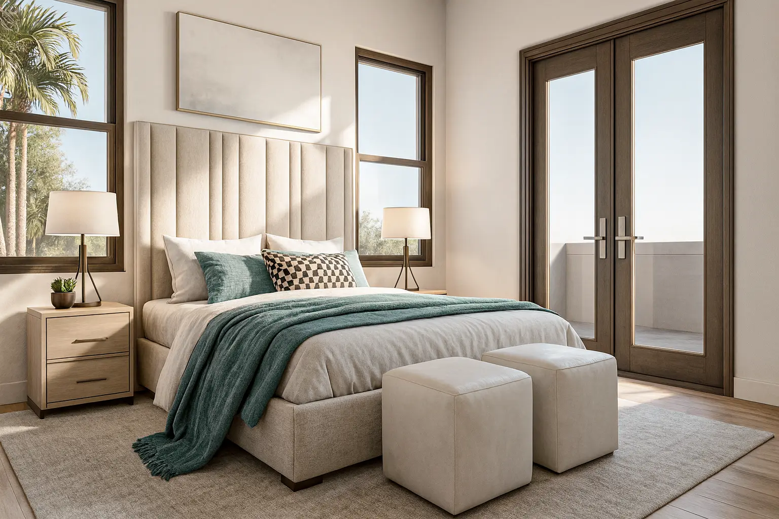 The main suite offers a private retreat, complete with a walk-in closet, a soaking bathtub, and access to a private balcony. Additional highlights include a flex-use den, a dedicated laundry room, and centralized air conditioning to ensure year-round comfort.