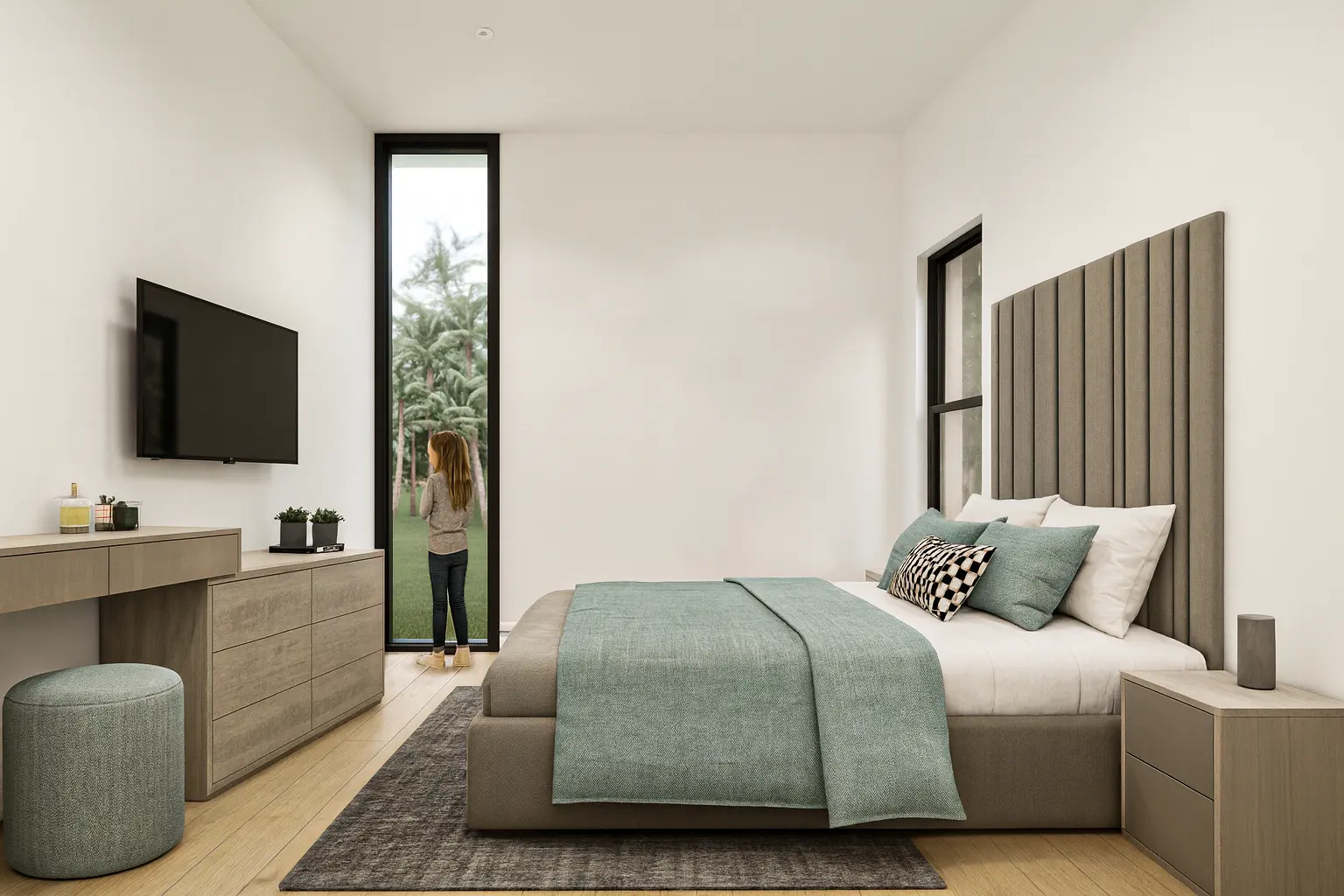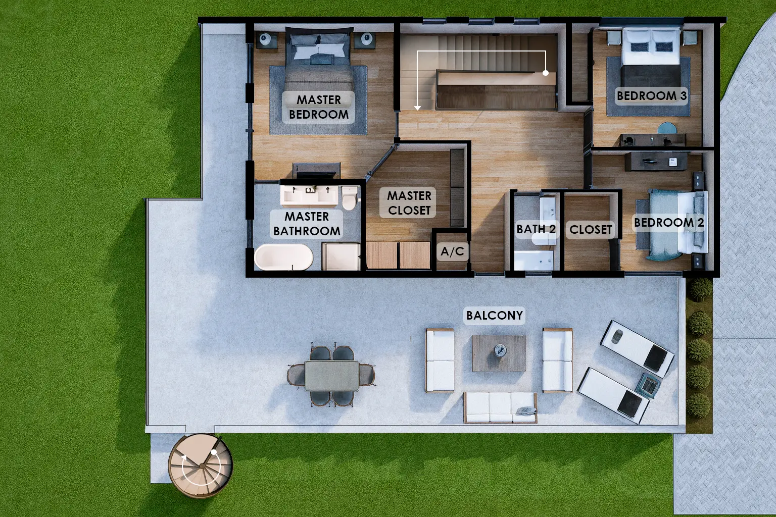 Outdoor living is enhanced with a private terrace and balcony, offering scenic views and additional space for relaxation. The main suite serves as a comfortable retreat, complete with a walk-in closet and a luxurious bathtub. Elegant winding stairs add architectural character, while centralized air conditioning ensures year-round comfort.