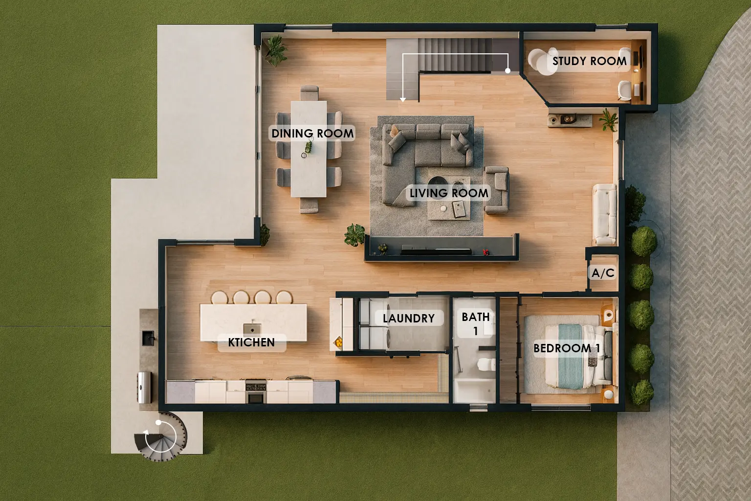 The Harvest Model features four bedrooms and three bathrooms, providing flexibility for family living and guests. The modern kitchen is equipped with a central island, making it perfect for daily cooking and entertaining. Additional interior highlights include a cozy den, a dedicated entertainment room, and a full laundry room for added convenience.