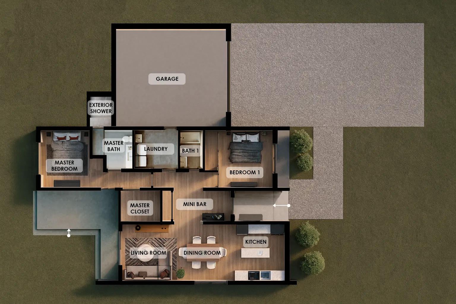 This model also includes an attached 540 sq. ft. two-car garage, providing secure parking and additional storage space. Outside, a private terrace pad creates a relaxing outdoor retreat, complemented by an exterior shower that extends modern living beyond the interior walls.